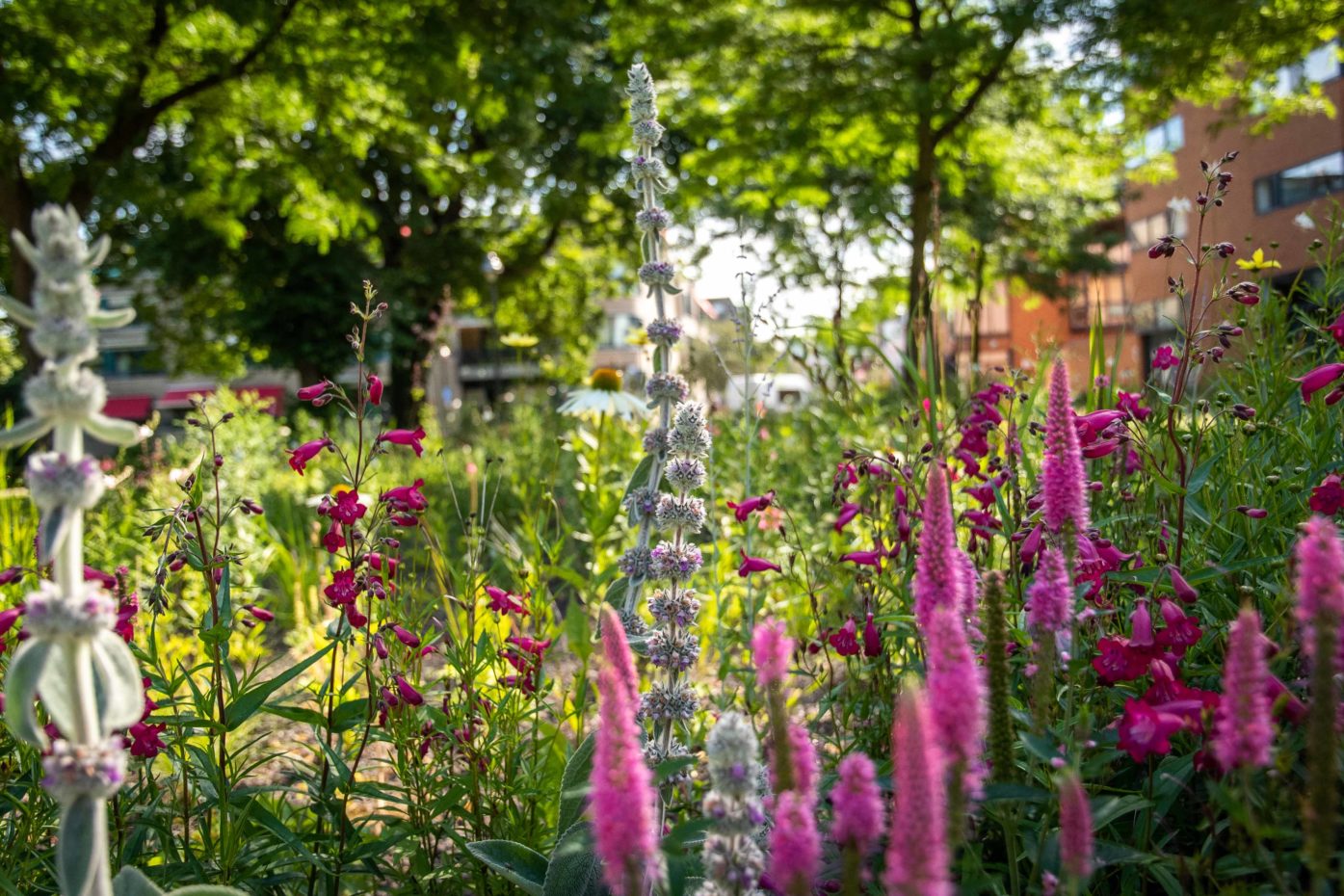 De opdracht was om de sfeer van de heide in de prairiebeplanting terug proberen te brengen. Apeldoorn ligt in een groene omgeving tussen bossen en heidevelden. Als je de hei van boven bekijkt zie je grote vlagen grassen afgewisseld met bomen en stuifzanden. Deze structuur hebben we teruggebracht in het ontwerp. Hierbij is rekening gehouden met de grote slagschaduw van de gebouwen en bomen.